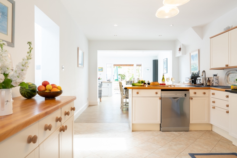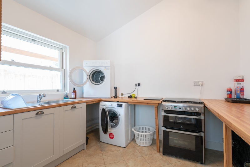 A short corridor leads to a large wet room (ideal for showering when coming home from the beach) and a utility room with a gas cooker, washing machine, tumble dryer, large ceiling airer and double sink with shower attachment (excellent for washing small dogs on returning from the beach!).