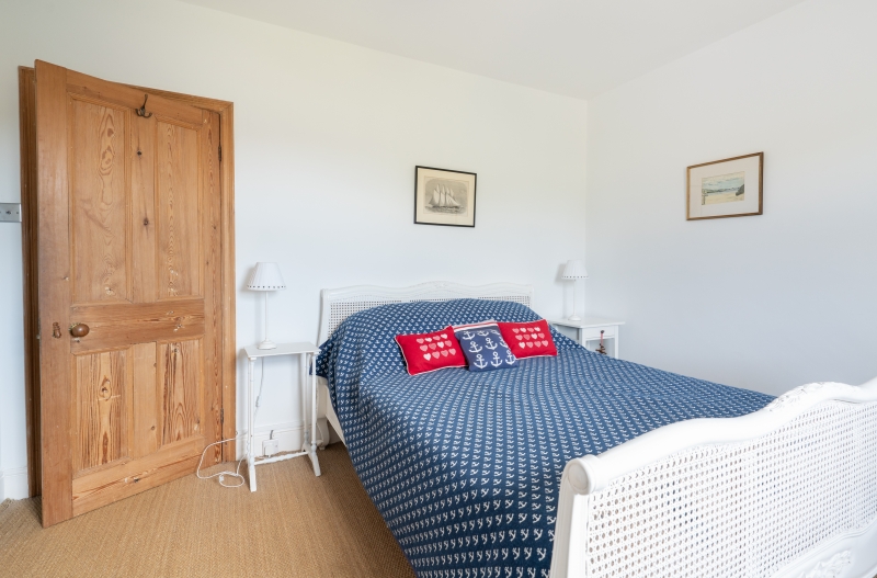 The living area has a door which leads to the hallway and wide staircase. The downstairs bedroom is accessed from the hall. It has a bay window and is furnished with a king size bed, side table, armchair, wardrobe and chest of drawers.
